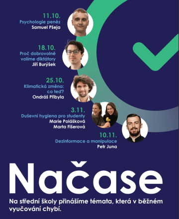 Jsme skupina studentských dobrovolníků, kteří se snaží zlepšovat české vzdělávání. Na střední školy proto přinášíme témata, která chybí v běžném vyučování. Zveme si zajímavé osobnosti, aby se studenty mluvily o dezinformacích, finanční gramotnosti, klimatické změně, duševním zdraví, populismu a dalších potřebných tématech. O mnohých z nich nemluvíme ve škole dostatečně, a to i přesto, že se nás dotýkají nebo že budou v následujících letech významně ovlivňovat naše životy.